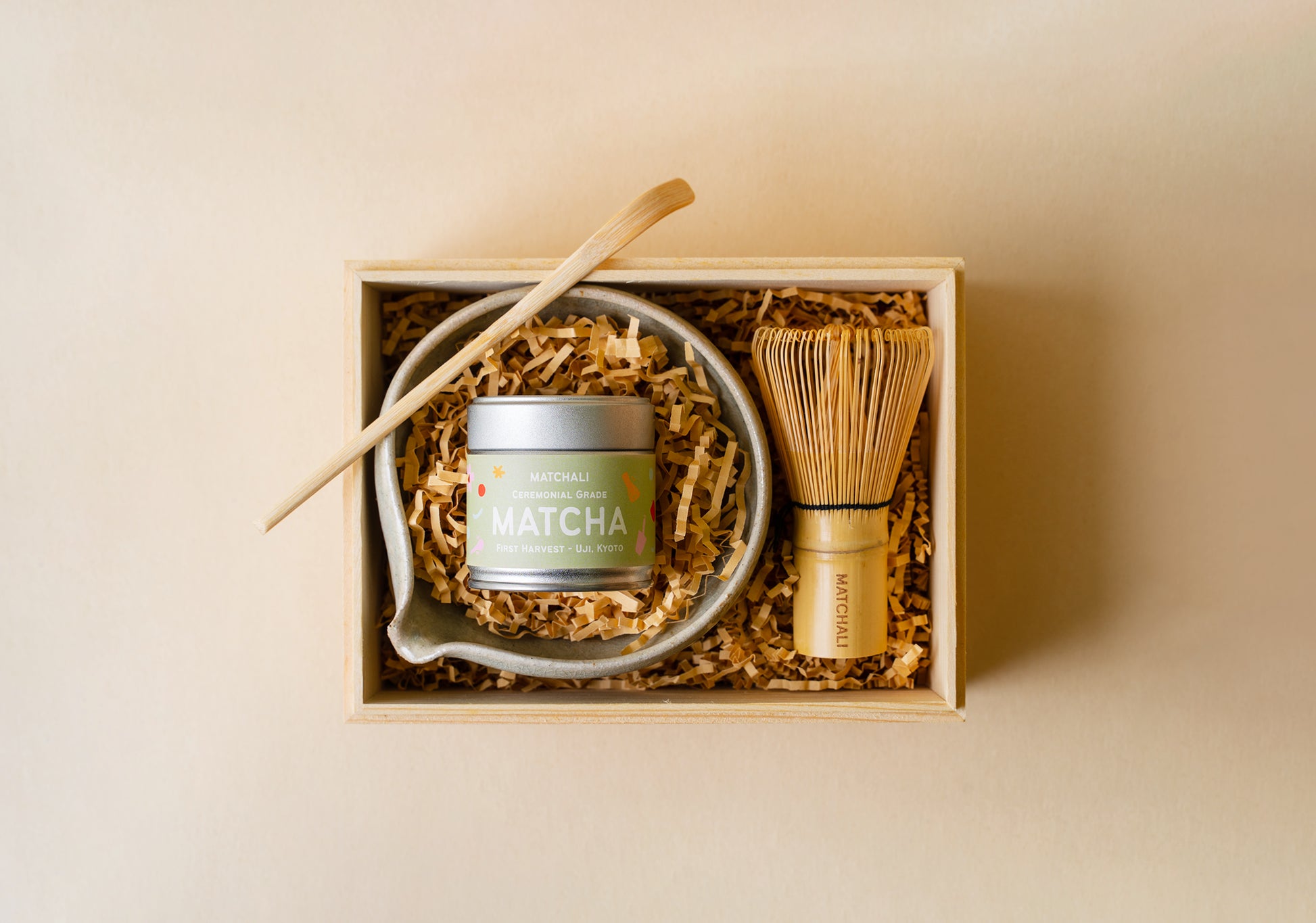 Our Premium Matcha Set is complete with all the essential tools needed to create a calming bowl of matcha with a handcrafted Katakuchi Chawan.
